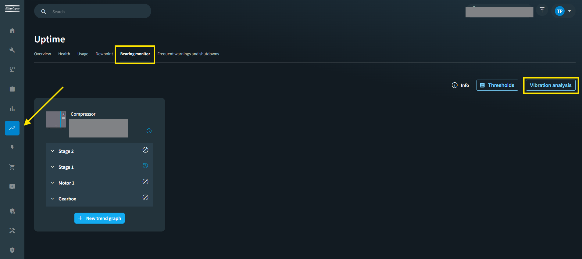 In case the machines in the site have fitted Bearing Monitoring Device and License, they’ll be shown below screen. They can request the report by clicking on Vibration Analysis from top right corner.