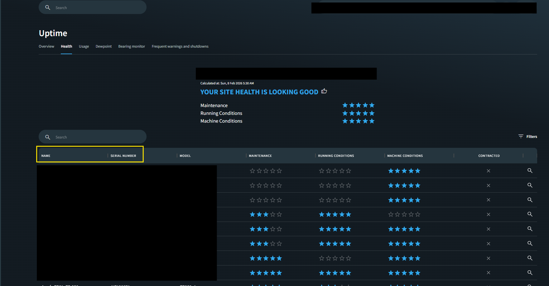 Machine name and serial number (S/N) are now visible in all machine-related tables, making it easier to identify and search for specific machines. These details are also included in exports. It’s implemented in below tables: