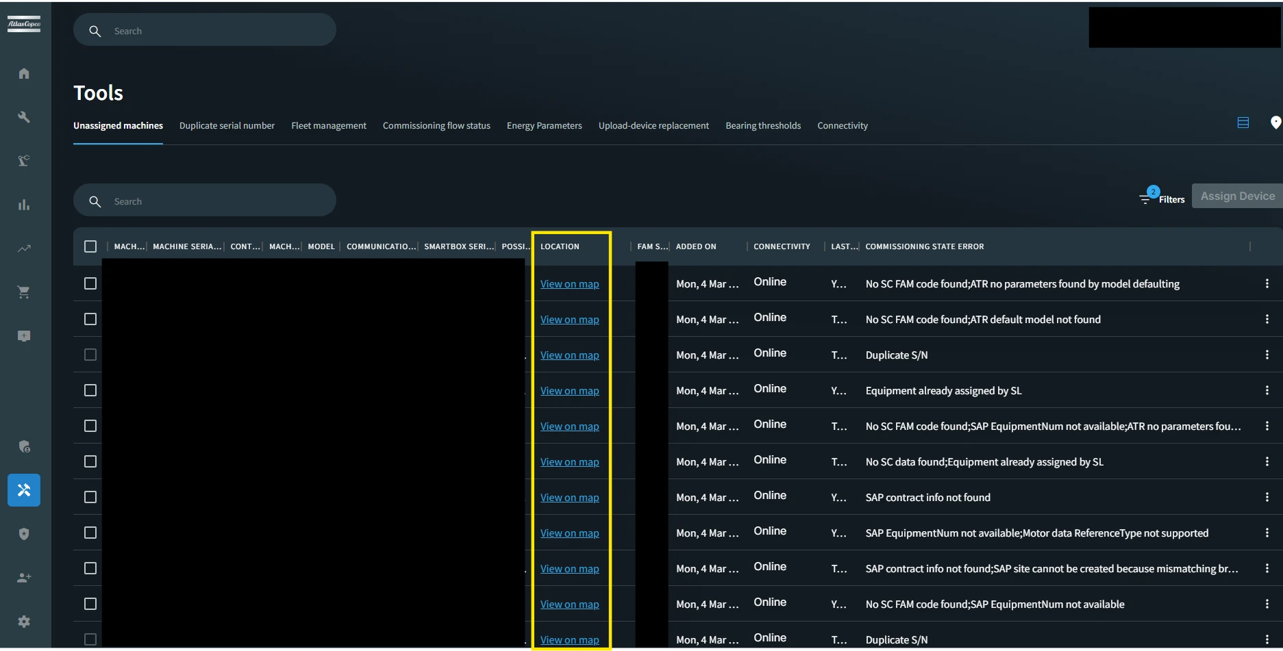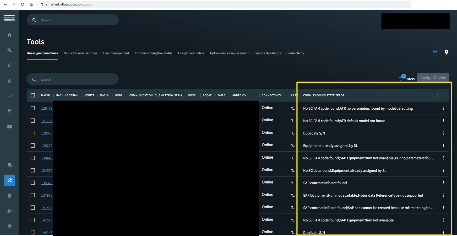 The Unassigned Machines table now displays the commissioning error reason for each machine, making it easier to identify and resolve issues.