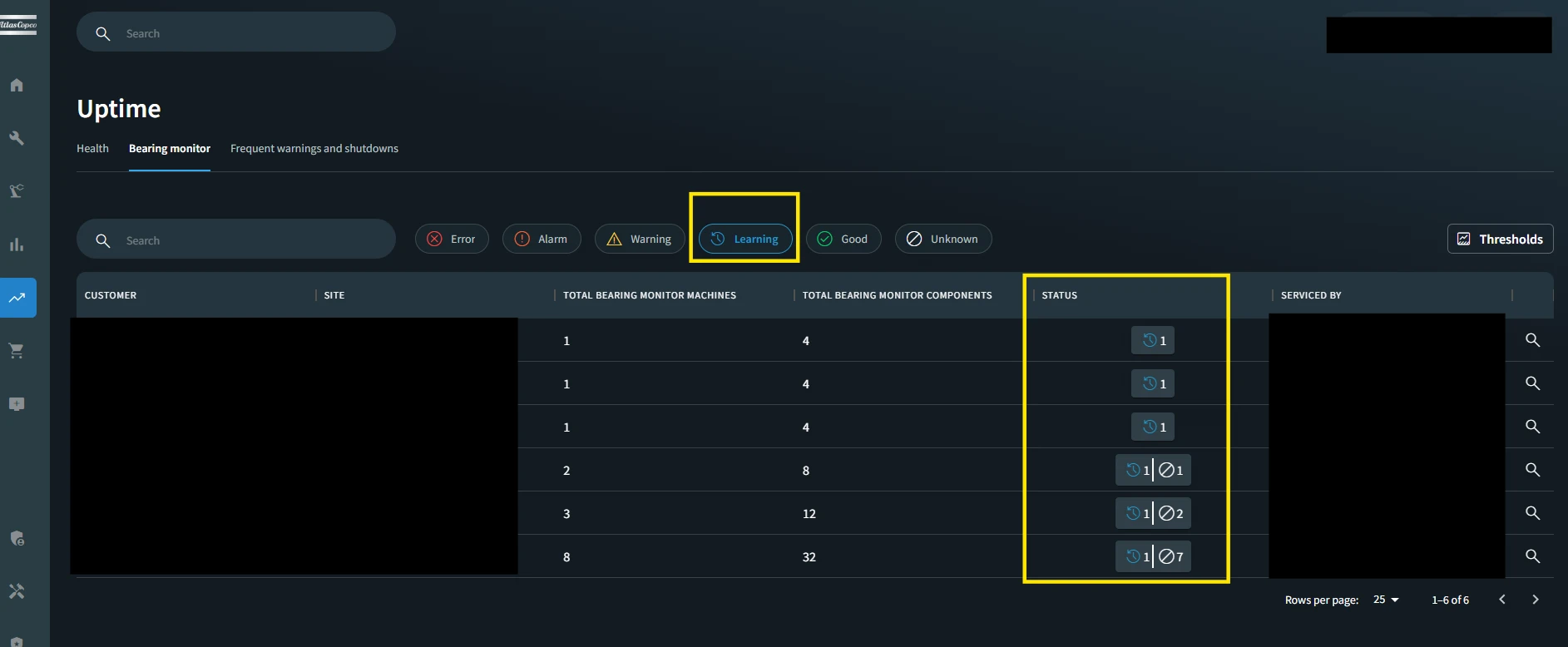 The Bearing Monitor filtering chips now work as expected for the selected status. Users can select the status and the machines with that status will be shown with this filter. This view is available at CC level scope and not at site scope.