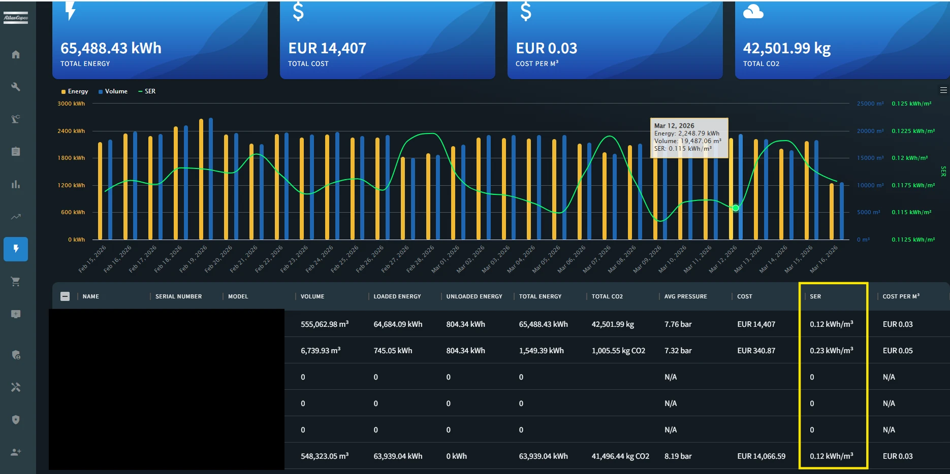 The default SER (Specific Energy Requirement) measurement unit is now set to kWh/m³ for the metric system and kW/100cfm for the US system, improving clarity and aligning with industry standards.